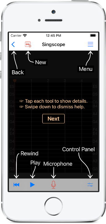 To use Singscope app, simply go to the Singscope View, tap on the Microphone button, and sing to your iPhone (or iPad/iPod). While you sing, watch your pitch graph being drawn in progress. Note that if Singscope does not respond to the voice, please make sure the Microphone is enabled for Singscope in the device's Settings > Privacy > Microphone.